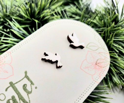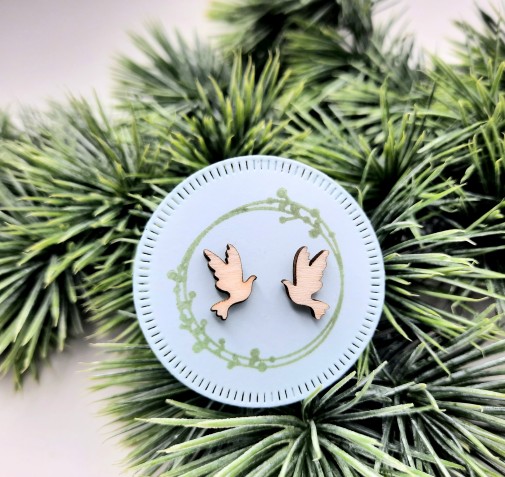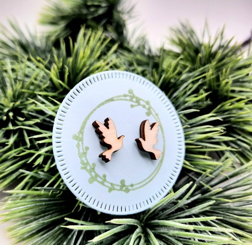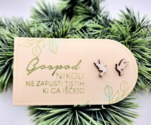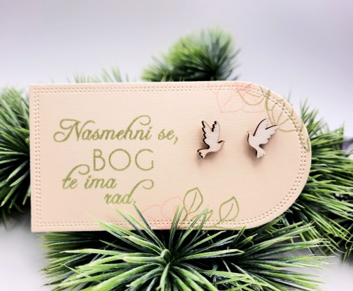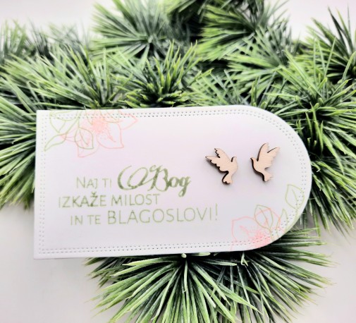 Darilo za birmo – Leseni uhani, golob v velikosti 1 cm x 1,3 cm in 3mm debeline. So na ličnem kartončku pritrjeni z gumijastimi čepki.